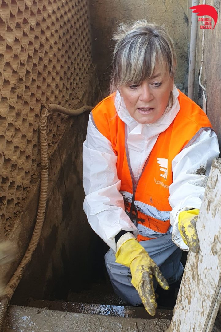 Una volontaria che aiuta a liberare un'abitazione dal fango lasciato dall'alluvione del 2 novembre 2023 a Campi Bisenzio.