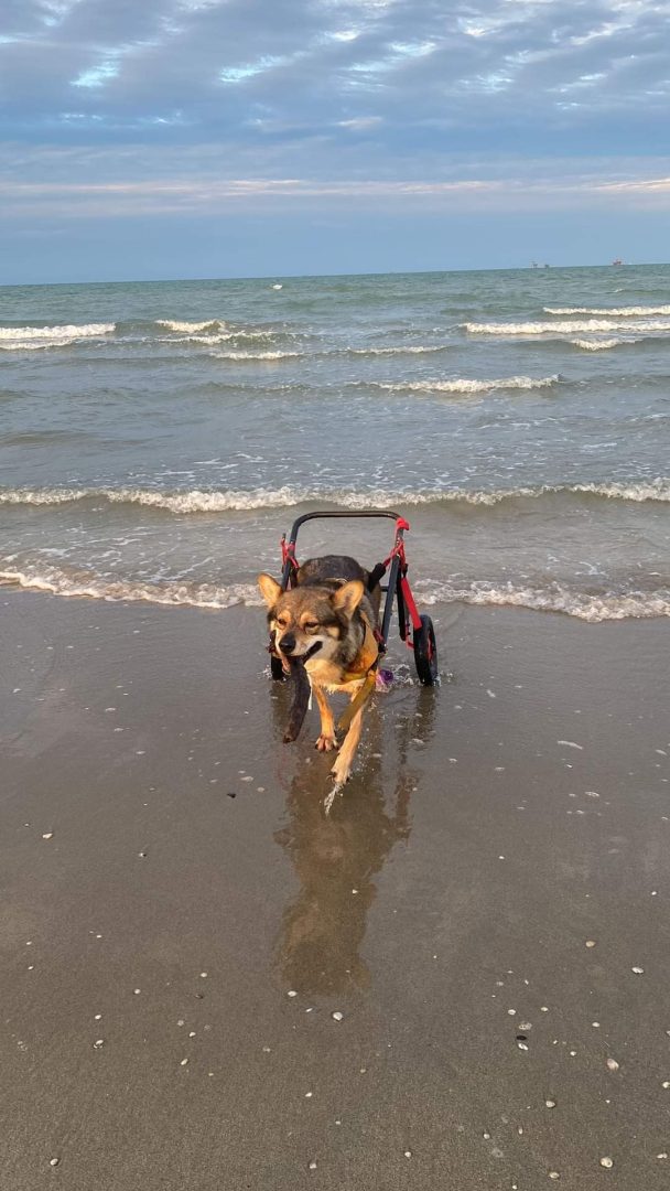 Rocko, lupoide di 7 anni, continua a tuffrasi in mare a un anno dalla paralisi, con il suo carellino , sempre felice !